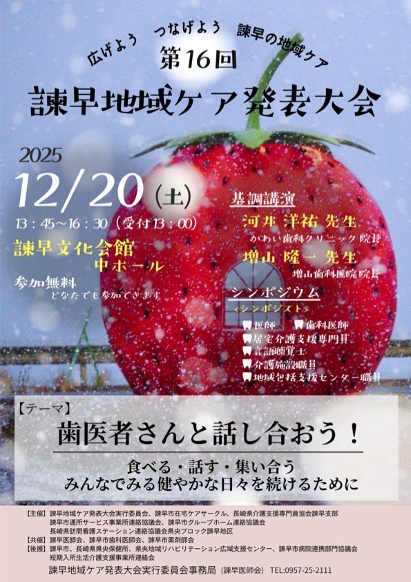 問い合わせ先:諫早地域ケア発表大会実行委員会事務局(諫早医師会) TEL:0957-25-2111