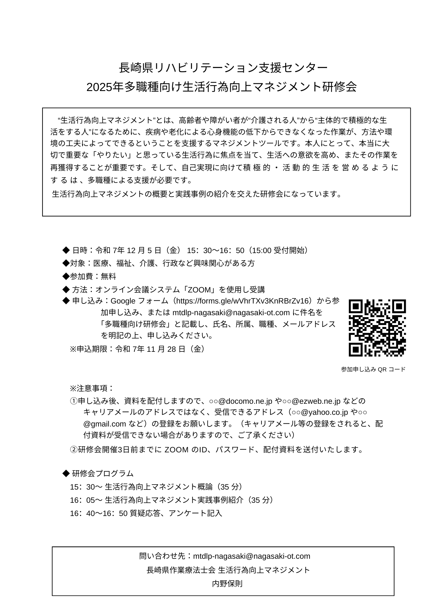 またはmtdlp-nagasaki@nagasaki-ot.comに件名を「多職種向け研修会」と記載し